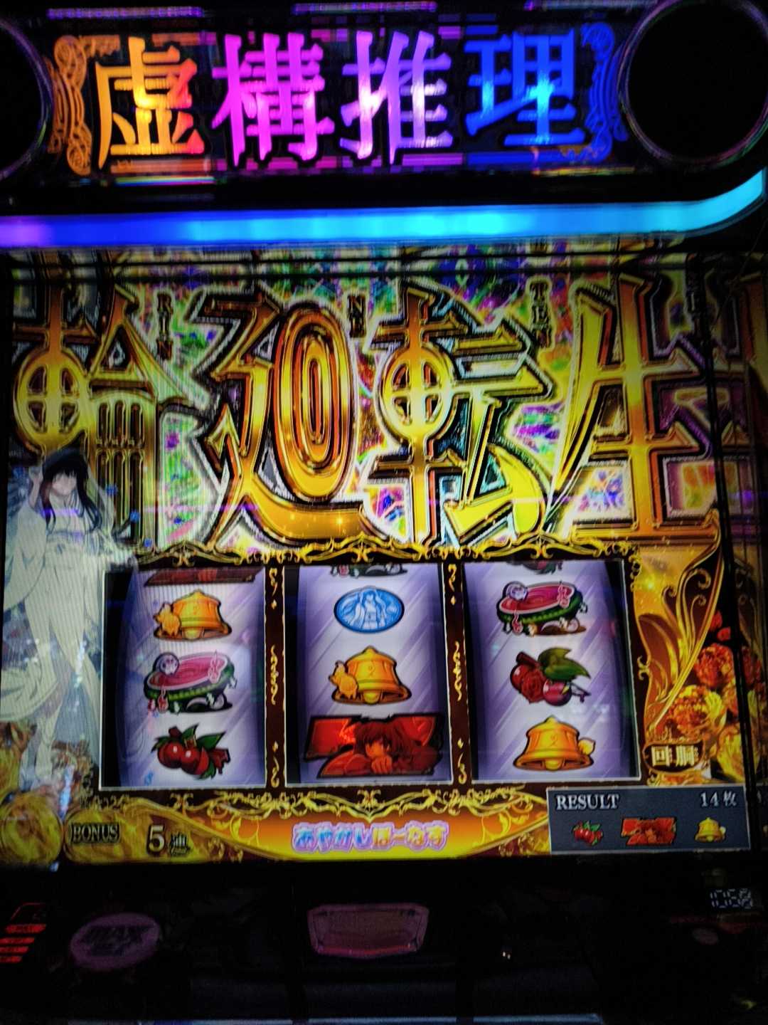 1000Gまでハマり3連400枚、そこから続行して150Gで2連150枚、そして800Gくらいまで持っていかれた後の白7からの虚構連中のあやかしボーナスでチャ目引いて輪廻転生突入。