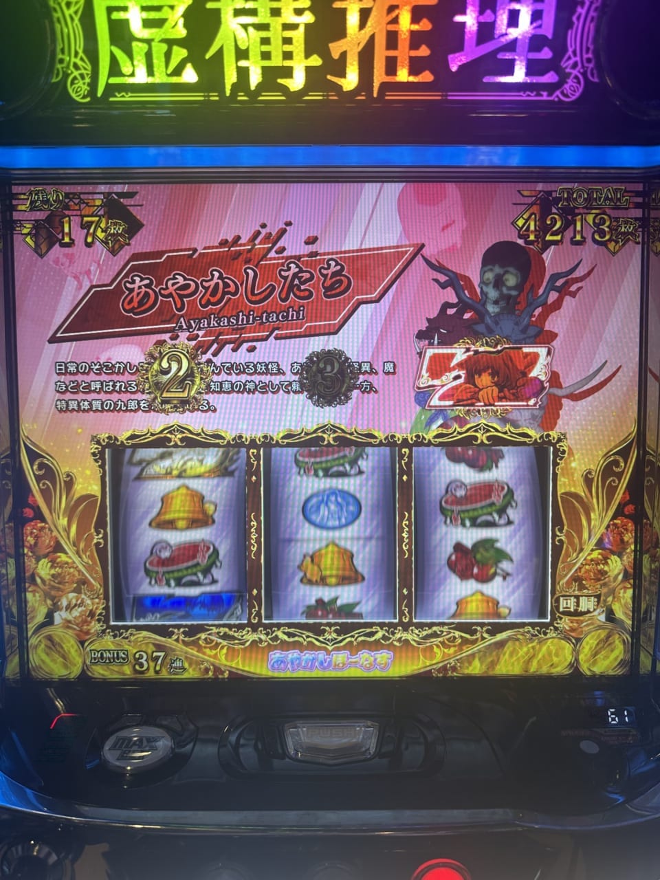 あやかしボーナス後と赤7、青7の後だと明らかに差を感じた