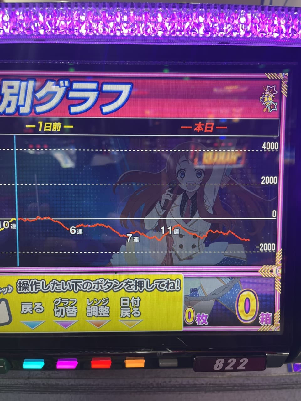 グラフ右上がりの4500枚出てる台に座ったがそこから徒花ボーナス8連、ようやく入ったATは2連で終わり。280枚