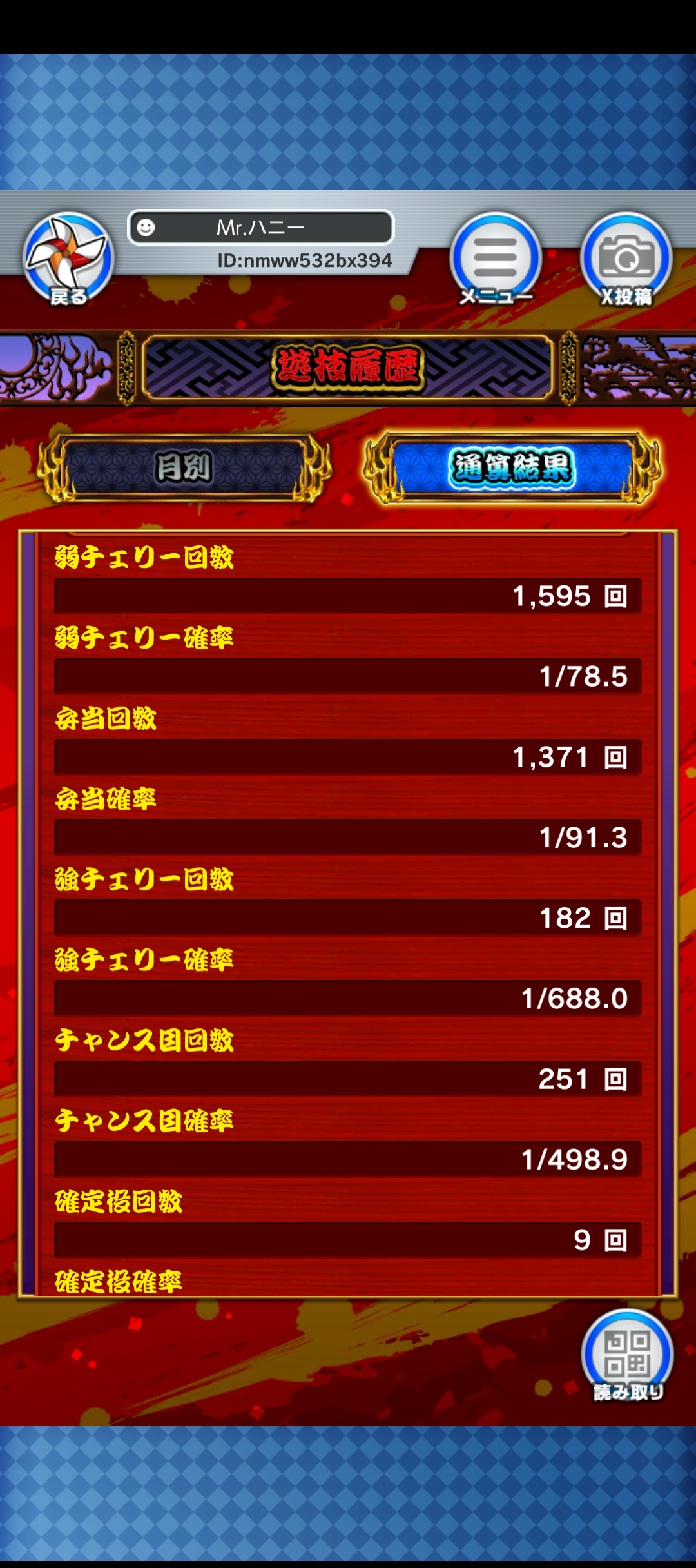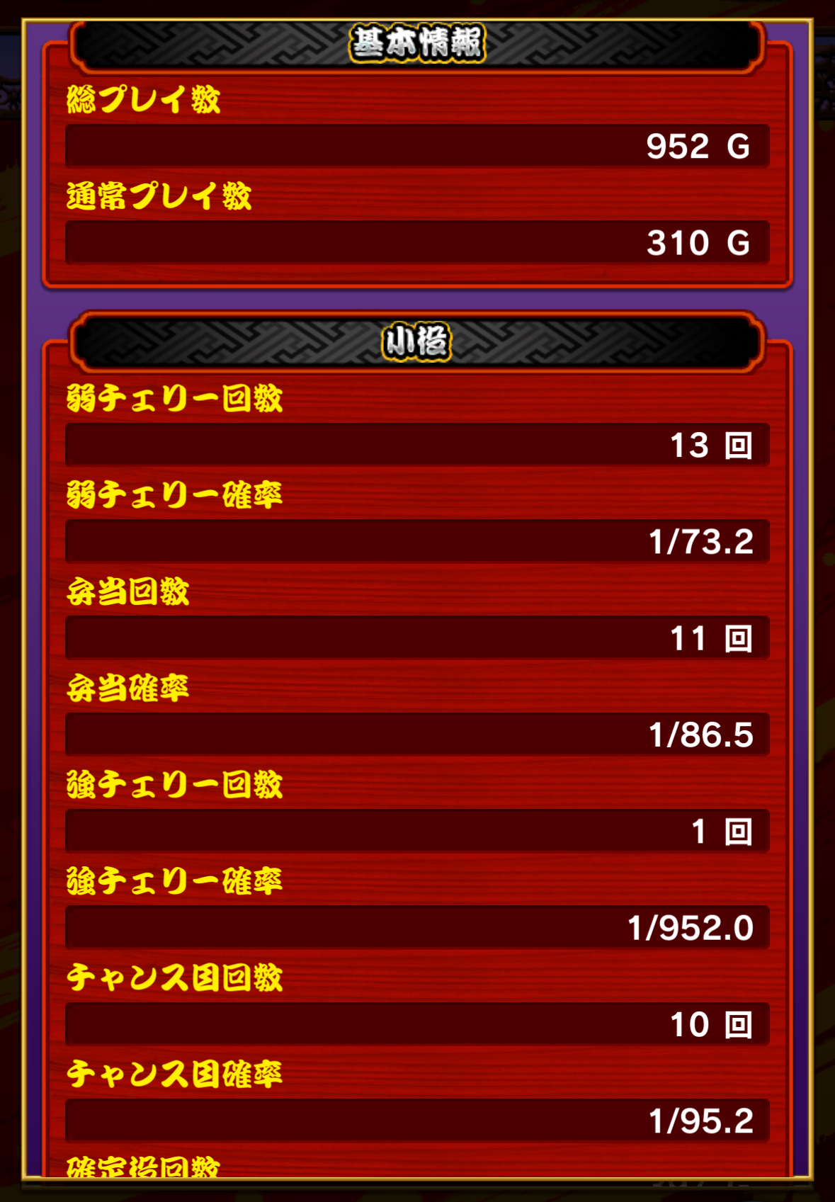 修行重りなしと招き猫、CZ赤オーラ、AT天守閣からのオニ平、上位AT愛の教育的武士道赤、激熱以外は一通り外し経験しましたね。将軍や絶頂マス前などの勝負所や上位AT中の小役上乗せなしで駆け抜け終了したり冷遇も多いですし…