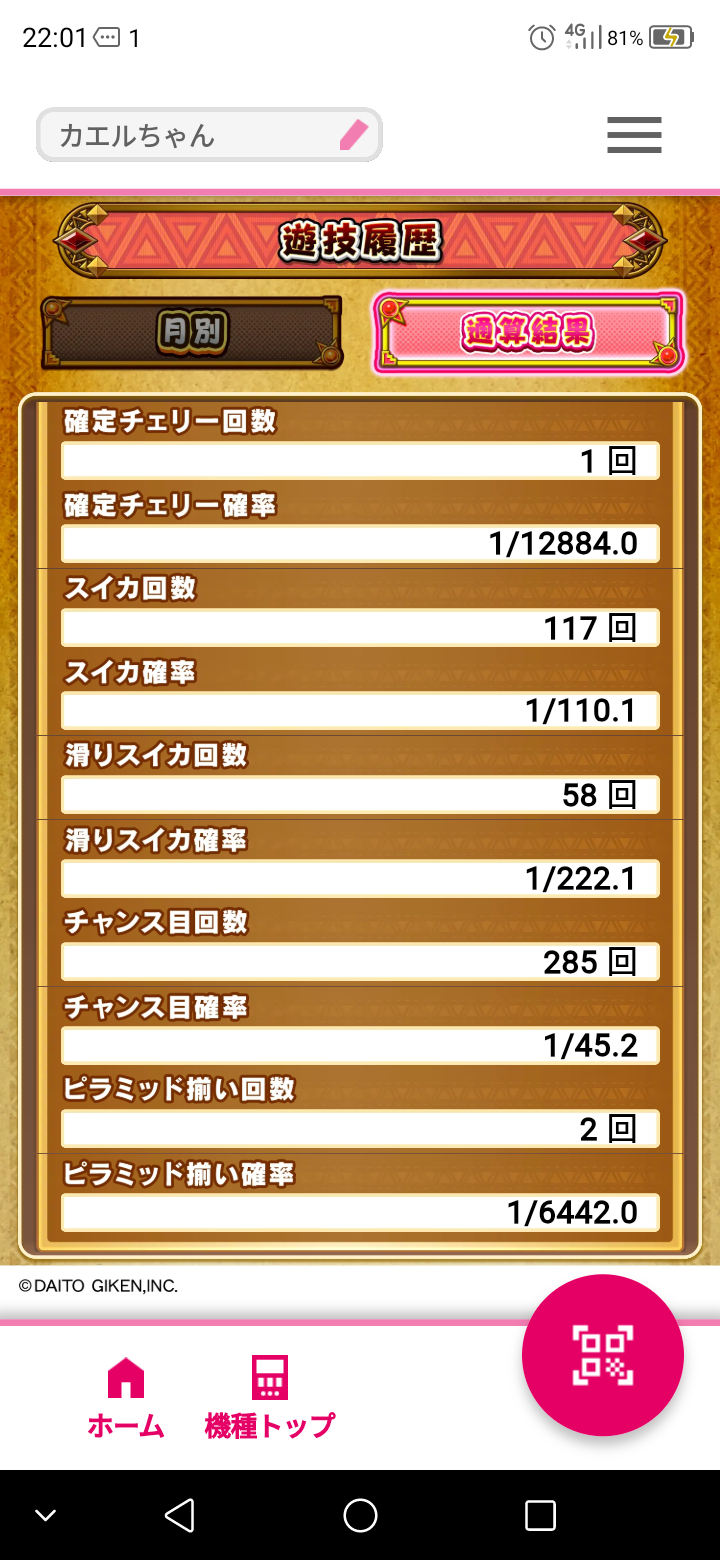 稼働データ1回ダイトモ抜けてるのでチャンス目確率トータル1/45.2。この話は夜から何度かでデータが有るならそうなのかとも思いましたが…かなり引けてない?ボク個人では日曜日の2回分です。