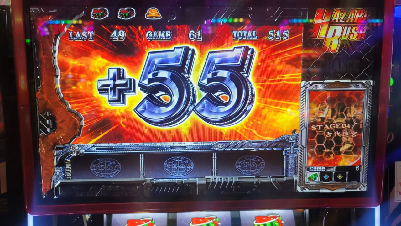 その後天井到着。ステージ2まで行くが何も無く終了。打ち切ろうと思い持ちメダルを消化してるなか、強チェリーからパニックゾーンを経由せずボーナスへ。またステージ2で終了。終了から30ゲームくらいで、強チェリーを引きパニックゾーンへ しかし失敗 数十G後 レア役を引かず パニックゾーンへ また失敗。その後 数十Gでまたパニックゾーン また失敗(引き弱) AT終了から130Gほどから、何やら怪しい前兆がざわざわ始め、地下坑道へパニックゾーンへ行かずステップアップ演出を経てバトルで勝利(強チェリーからレア子役は引いていません。)そこで 7がシングル揃いでプレミアムハザードラッシュでした。顛末を説明するために長文になりましたこと申し訳ないです。 なぜプレミアムハザードラッシュに当選したのか?推測できる方 教えていただけないでしょうか。子役当選など抜けがある可能性があります。ご容赦ください。