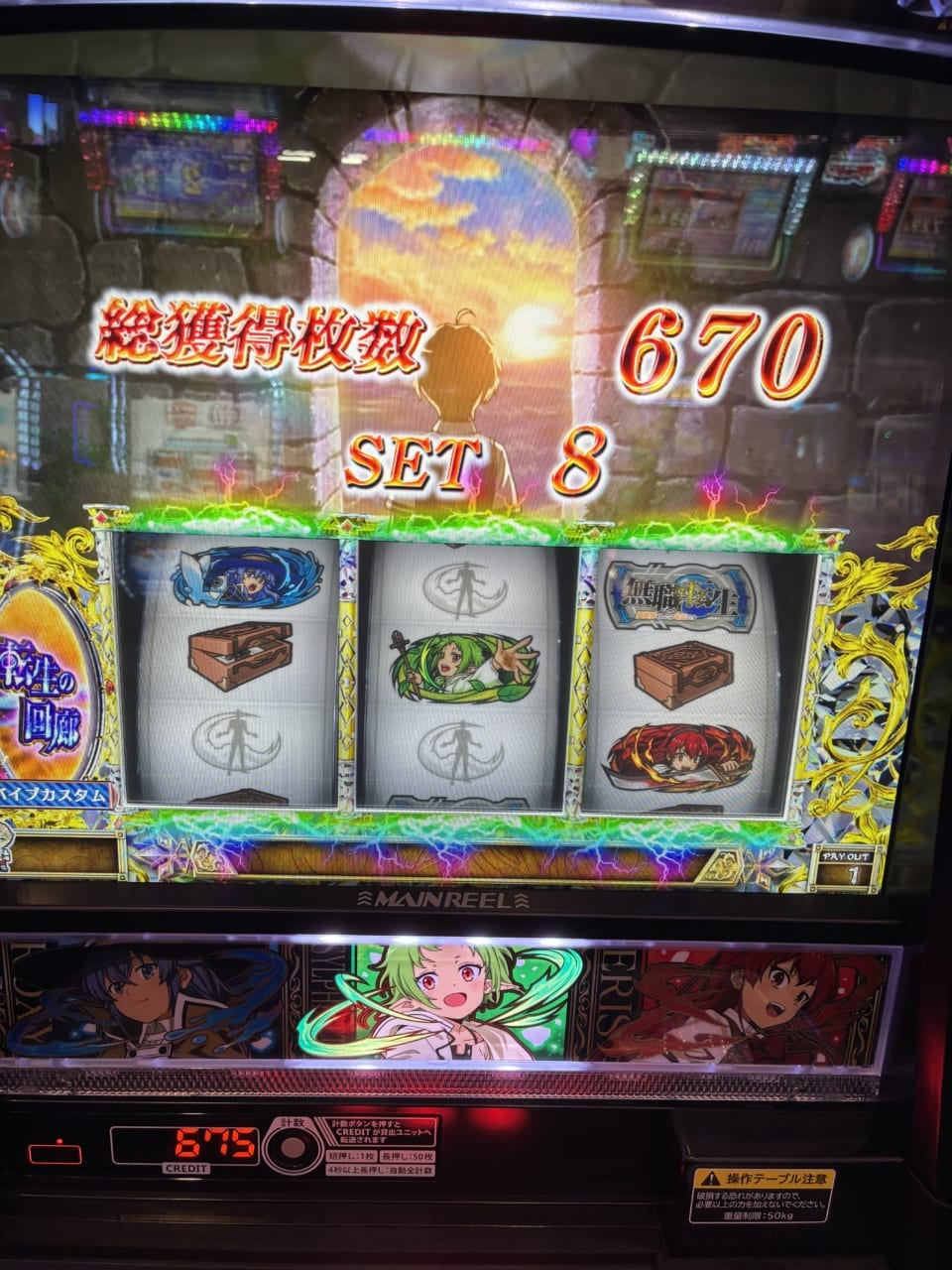 ただ35セット超えて48セット目でエンディング、上位だ〜と思っていたらターニングポイント2を失敗し、そのままエピボ無職転生を持ってきて再度下位ATをやらされました…。