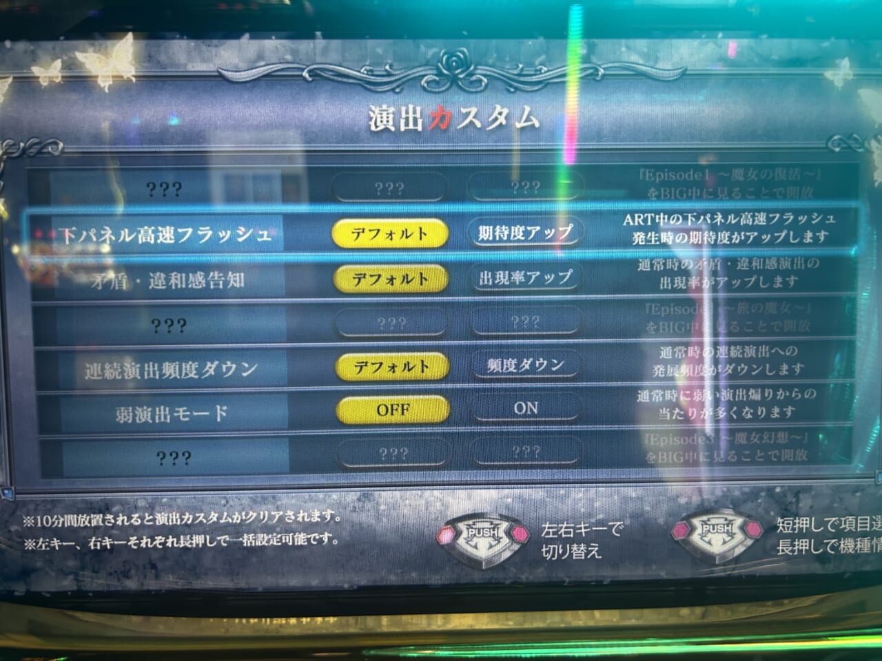 演出カスタム画面に表示された内容を達成していると、該当のカスタムが解放される。なお、10分間放置すると演出カスタムがクリアされる仕様で、左右キーをそれぞれ長押しすると一括設定可能となっている。