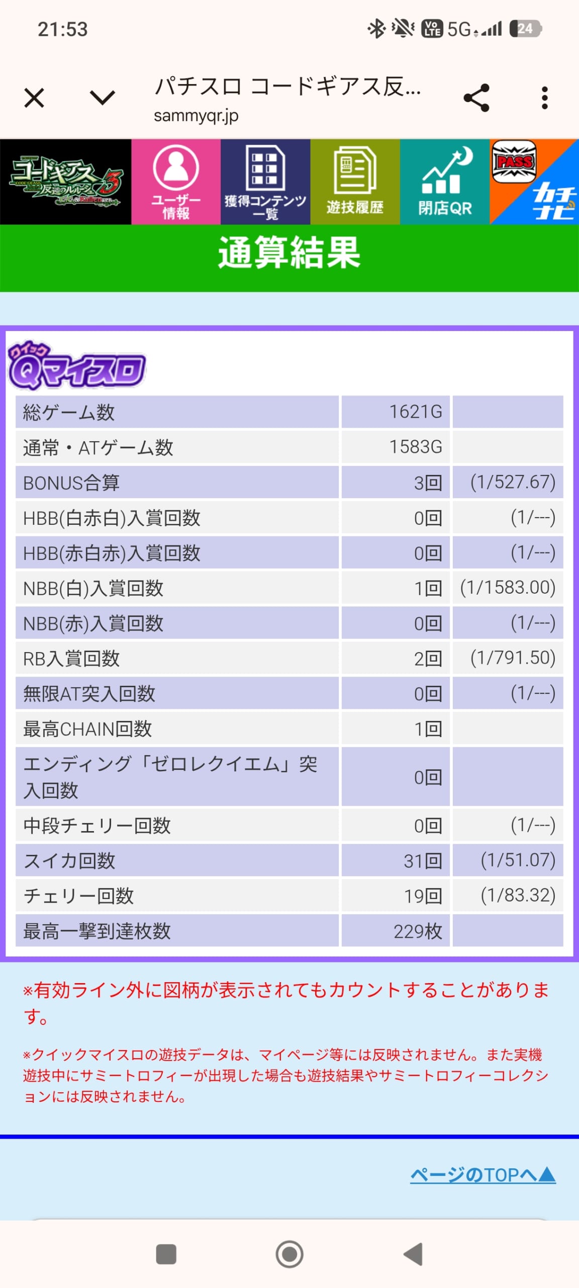 ウソくさ。開始1500ゲームまでの終了画面が4回連続カレン。その後5,6回?連続デフォのルルーシュ。設定差ありのボーナスは一回も引かず。スイカビッグが三回。チャンス目は12回くらい引いたけどボーナス0。なんか周りが赤いエフェクトで扉が閉まってチャンス目で、屋上に移行して猫追っかけリーチの赤タイトルが外れてイラッとしてやめました。開始9ゲームでチェリーからビッグ引いてずっと持ちコインだったから800枚位浮いたけどサミーの台はマジでウソくさ!