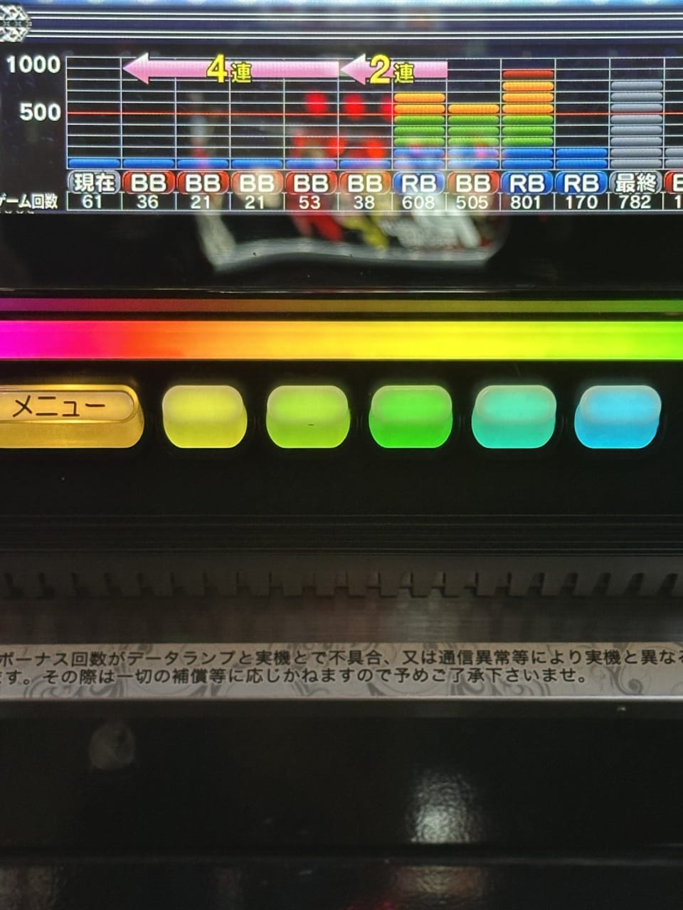 しかもDTはループ率高めでした。ボーナス5回で500ゲーム続いたので恐らく最初にはいったDTは400ゲームだったかと思います。