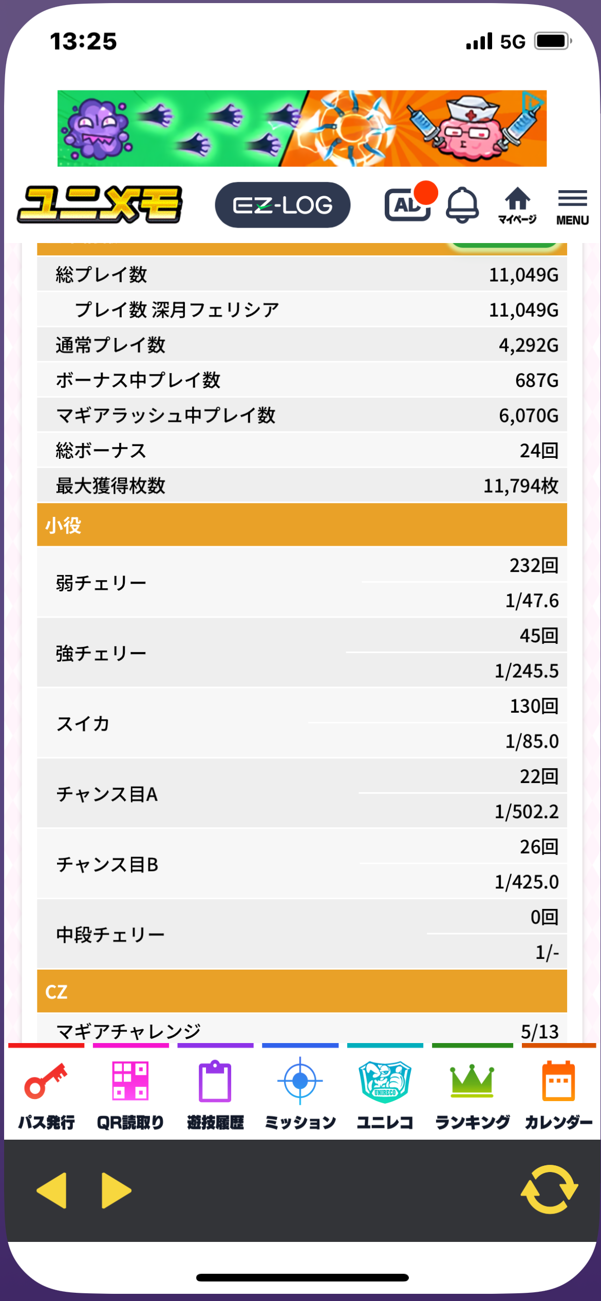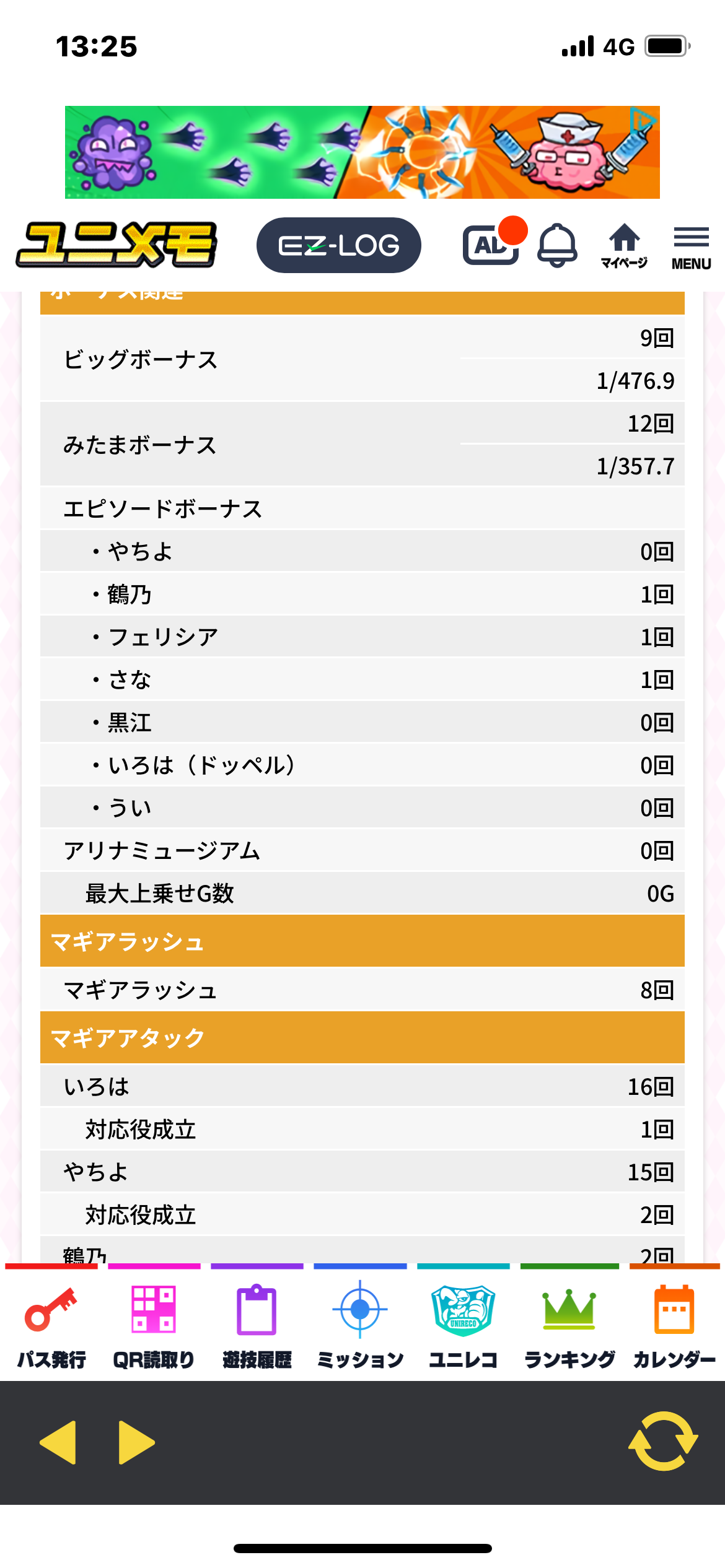 天井→バケ→300ゲーム台マジチャレ当たり→バケ→ラッシュ駆け抜け→ラッシュ直撃駆け抜け→天井→赤7ラッシュ無し→700p→赤7ラッシュ無し→100Por強チェ→赤7ラッシュ無し→100p→バケ→190ゲームマジチャレ→赤7→ラッシュ→500枚終了