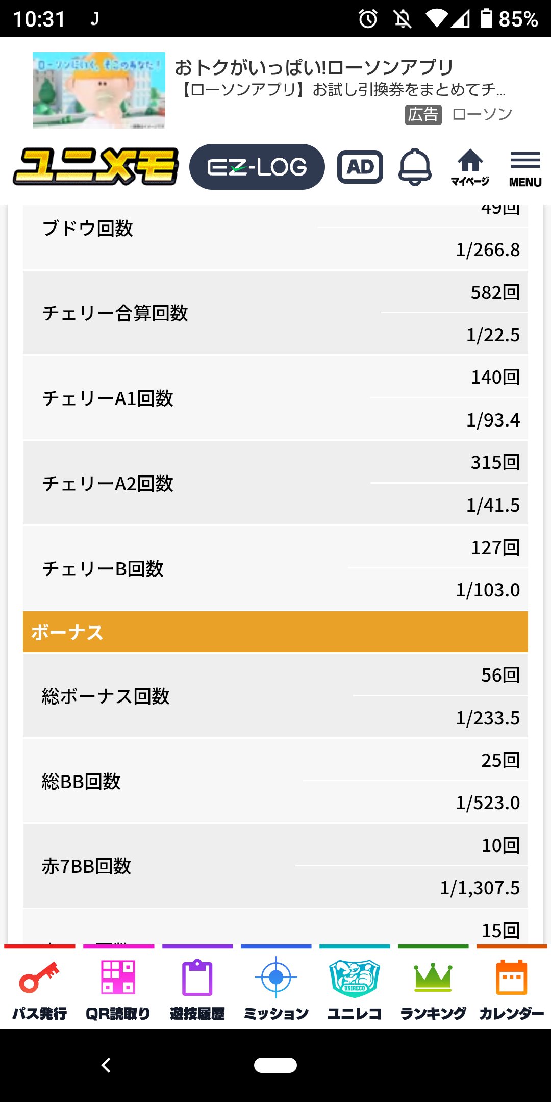 ブドウ3回、3枚役6回、チェリー2回取りこぼしに加え、REG中に2回順押しでNG箇所止めちまったから79枚損失してる。あとほボーナス成立後のフラグ判別による無駄回しが多少(これは必要経費か)あるから、キリ良く見積もって損失21枚とすると100枚は損失を軽減出来たはず。