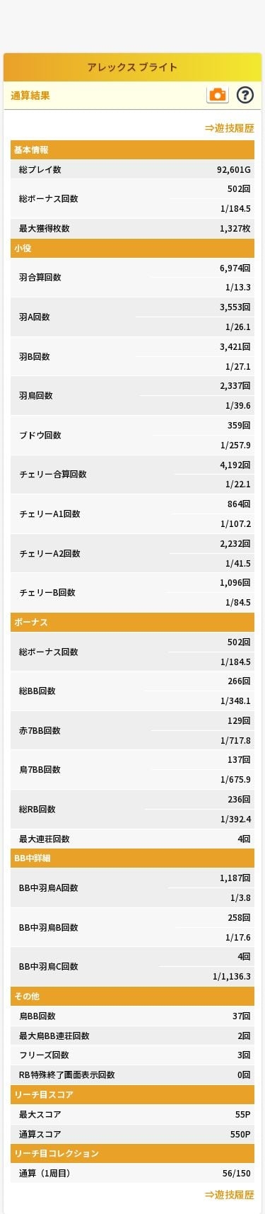 →通路じゃねえだろ。稼働が無ければそもそもボーナス成立しません。自分で100回ボーナス引いたのか、それとも誰かが打ってるのをガン見してたのか、その両方か。てか、ボーナスフラグ成立ゲームの演出を全部記憶してるって俺でもできんわ。本当はアレックス大好きなんだろ?