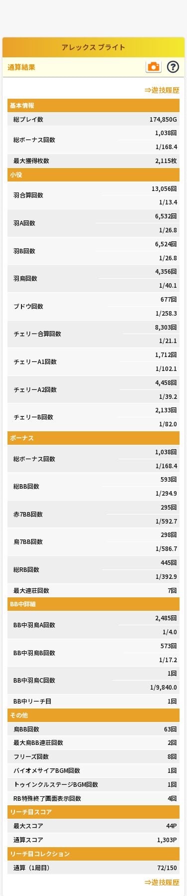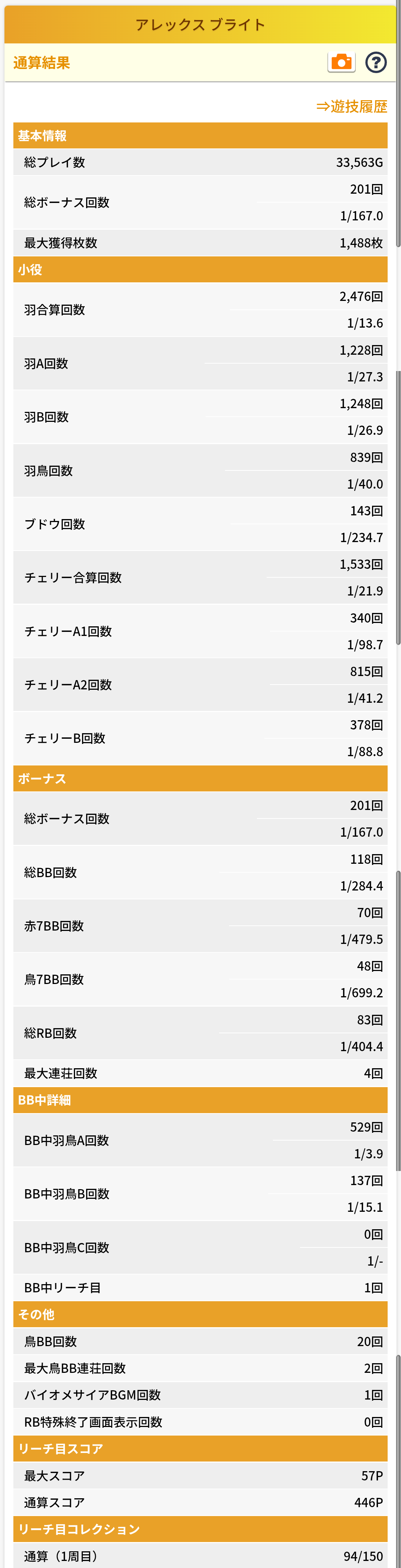 ただ、BTによる10%の175枚上乗せにかなり割を食われている印象。BT引けなければ1は当然爆〇、6でも安定感ないと思う。あと個人的にはリーチ目マシンは難解リーチ目を見抜いての1枚掛けがだいご味だと思ってるからBTとリーチ目マシンはあまり相性よくないというのも思わされたかな?そういう意味ではエヴァとかはBTとの相性抜群でした。アレックスに関してはナイツとかハイパーラッシュみたいなAT機でフライングベット機能ある仕様の方がBTよりも良かった気がする。