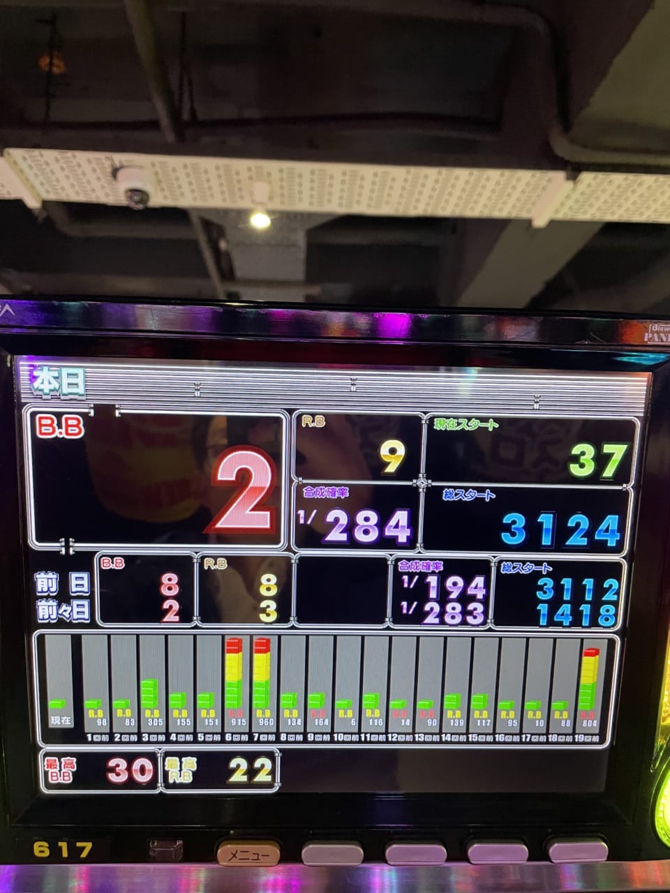 結局2000枚のマイナスでした。途中で2回目のビッグ中ハズレを引いてビッグ確率以外は全てまともな数字だったのに…判別は設定5が99%