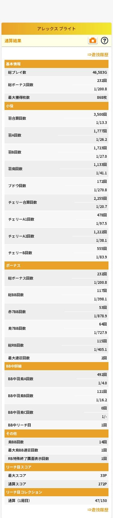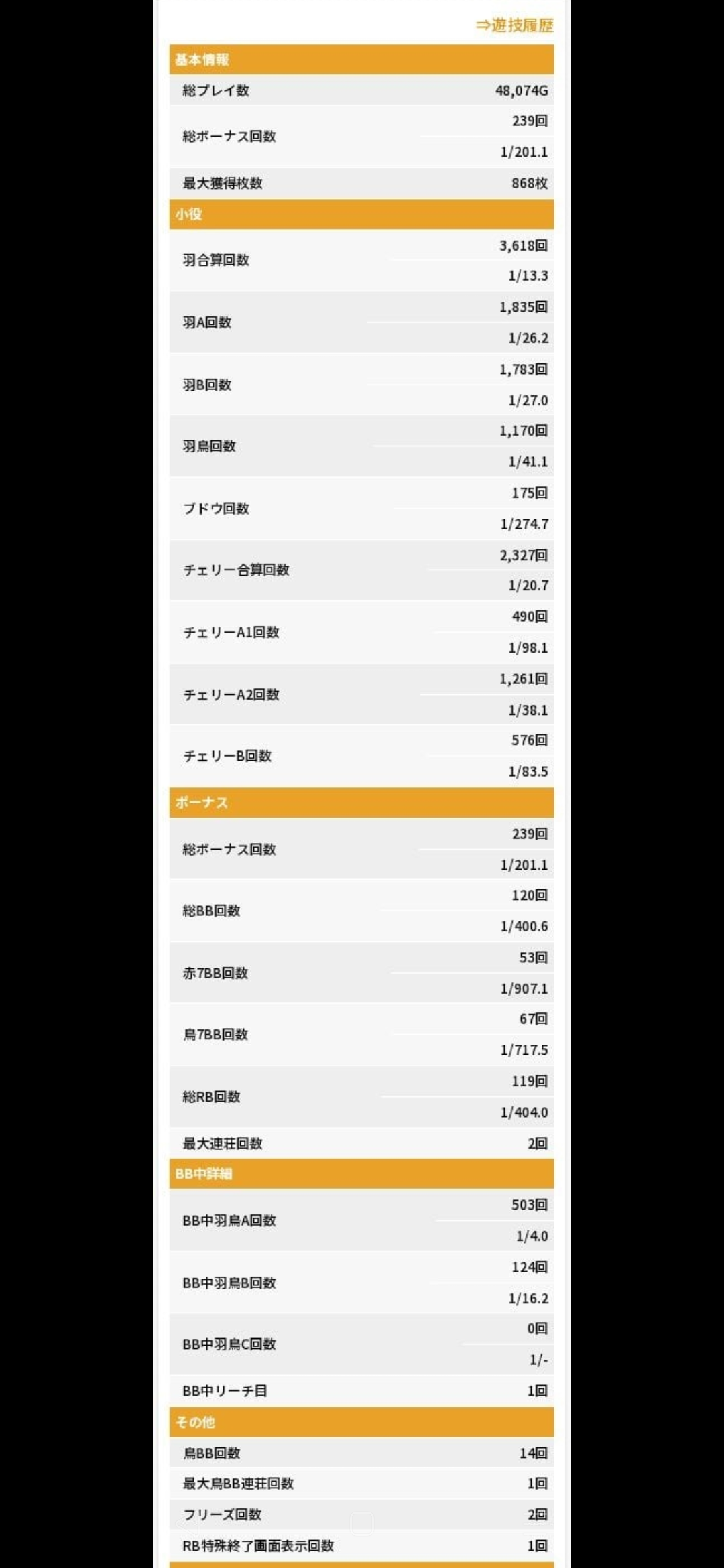 小役の出現率についてはチェリーAの引き強分はプラス33枚、羽の引き強分はプラス59枚、ブドウの引き弱分はマイナス34枚、3枚役の引き弱分はマイナス35枚が本来の確率と比べてのブレとして現れているが、これは誤差の範囲ということで無視して良いかも。