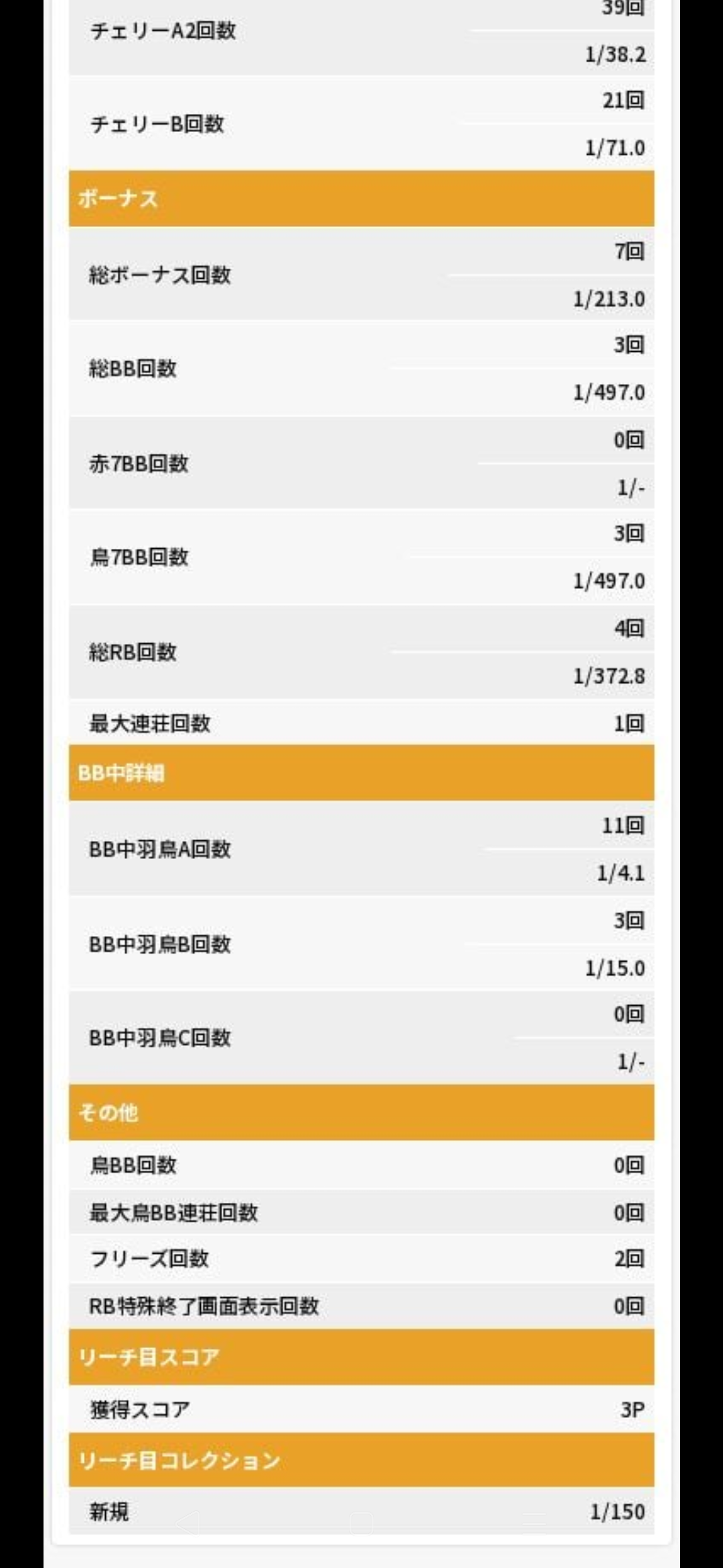ブドウ3回、3枚役6回、チェリー2回取りこぼしに加え、REG中に2回順押しでNG箇所止めちまったから79枚損失してる。あとほボーナス成立後のフラグ判別による無駄回しが多少(これは必要経費か)あるから、キリ良く見積もって損失21枚とすると100枚は損失を軽減出来たはず。
