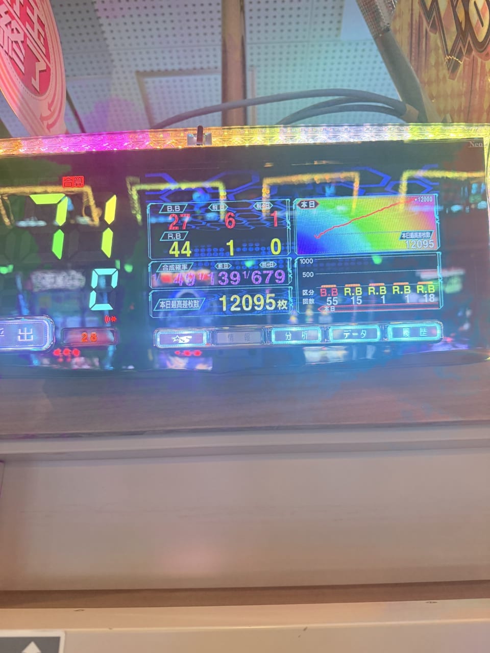14時から0回転のバベルを打ち始めて247回転でB.B初当たり後R.B2連、B.Bでループに入ってからB.B25回R.B4回の71連チャンで12095枚で閉店…