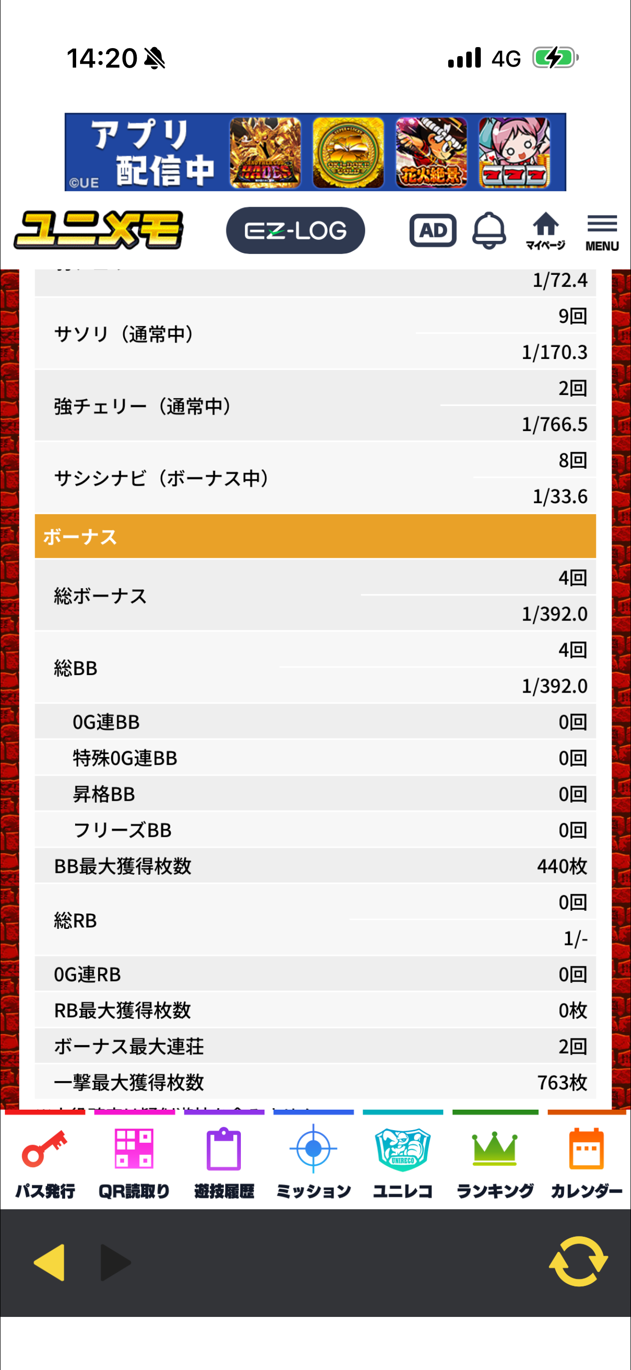 強チェは13回引いてボナなし。さそり6回目引いたときの600Gで天国に行ったけど、最低限の1回ビッグ飛んできて終わり。