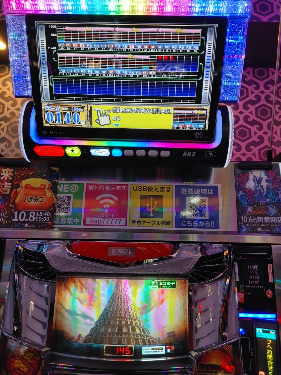 一部の人達だけが懐かしがって、朝一高設定を狙って打って、後は右肩下りの散々なグラフになるとしか思えない台。緑ドンの低設定がまだ戦える台だったら打ったかも知れないが、期待度0になったユニバ、流石にこれは一ゲームも回せない。