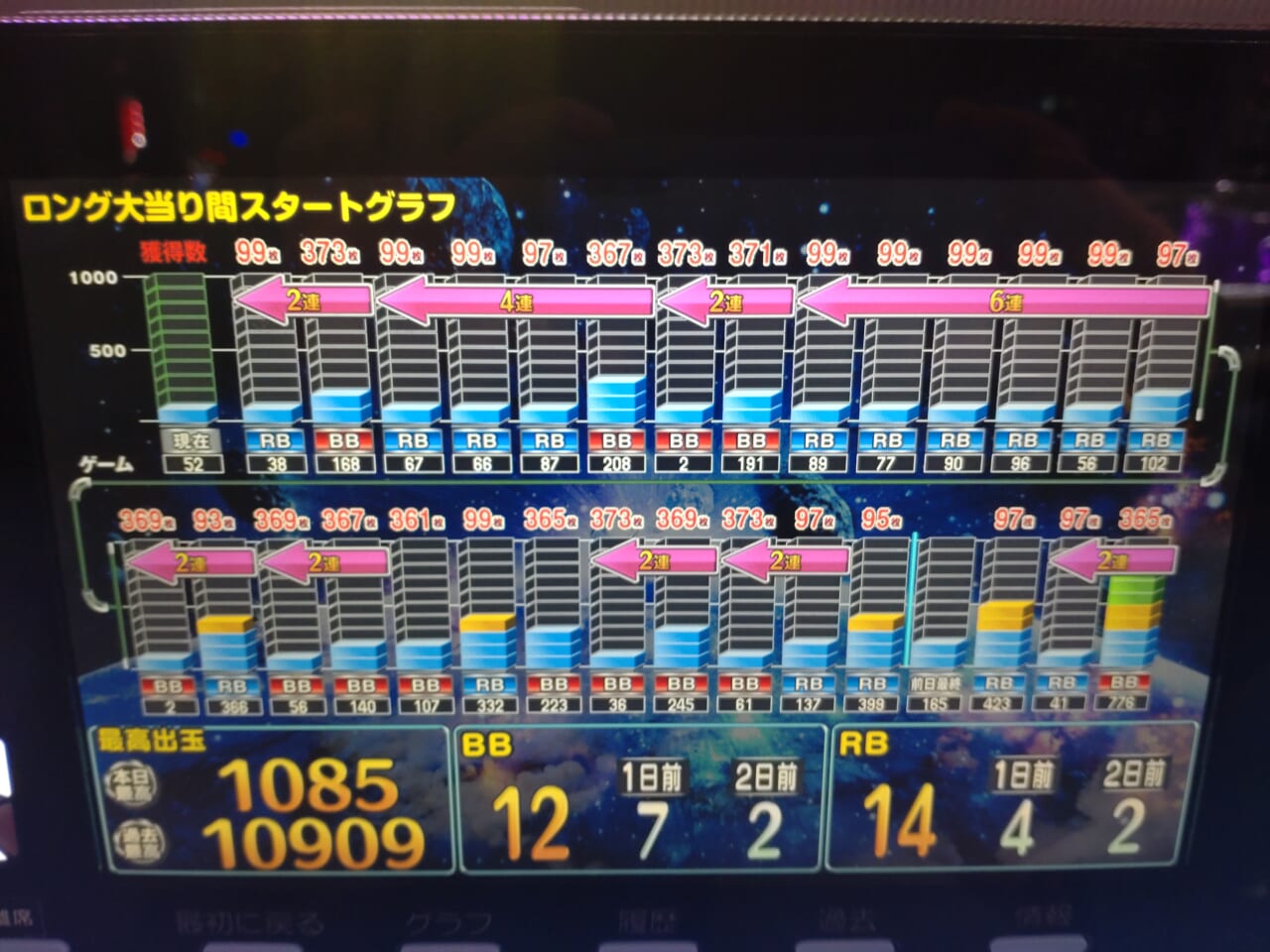 ようやくビッグバンモード行きました。朝イチ浅いゲーム数でバーを2回引き、そこから大ハマり。途中レバーオンでプラネットランプが一瞬点滅し、ビッグを引かなかったのでモードC濃厚と思い、全ツッパを覚悟したが、そこからボーナス7スルー。8回目のバーでようやくビッグバンモードに入り、そこから大連チャンで一撃約7000枚出ました。ネオプラネットの通算負け分を全部取り返して、少しお釣りが来ました。